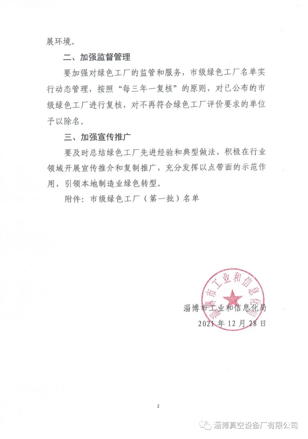 淄博真空設(shè)備廠有限公司獲得淄博市第一批“綠色工廠“榮譽(yù)稱號”